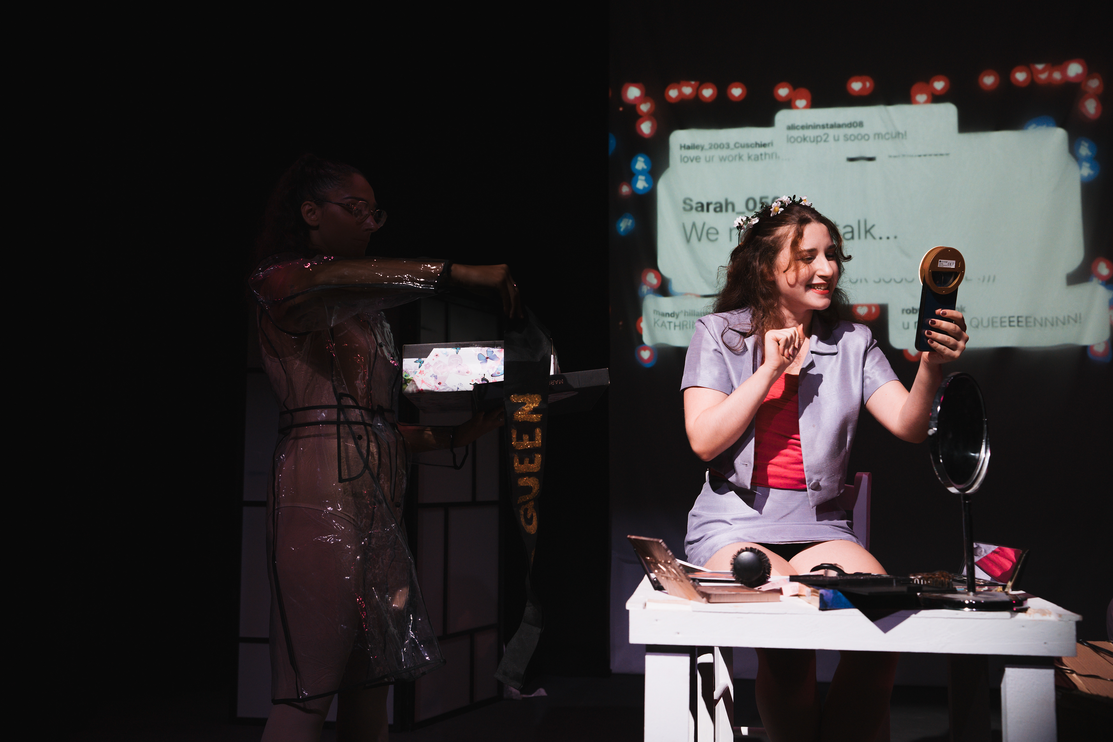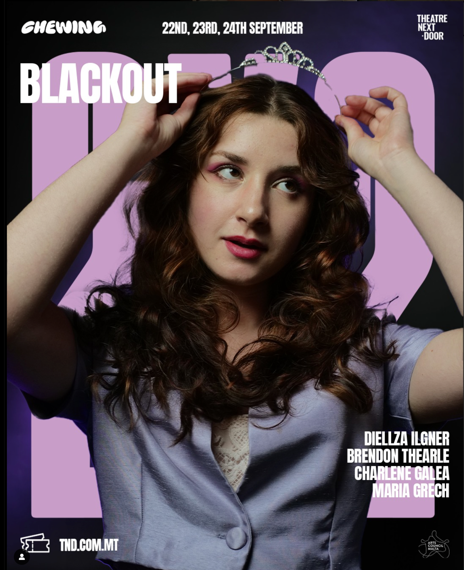 Premiered at Theatre Next Door, Malta 2023 September 2024 at Neues Schauspiel, Leipzig Germany Meet kathrin, an inspiring influencer and everyone’s best friend — charming, young and proudly dazzling. kathrin is everything she wants to be. well… at least on social media. but what happens when someone pulls the plug? a devastating blackout hits the whole area, upturning kathrin’s superficial existence; confronted with the silence around her and the taunting voices within. will the blackout act as a catalyst for change — or become a real-world blue screen of death?