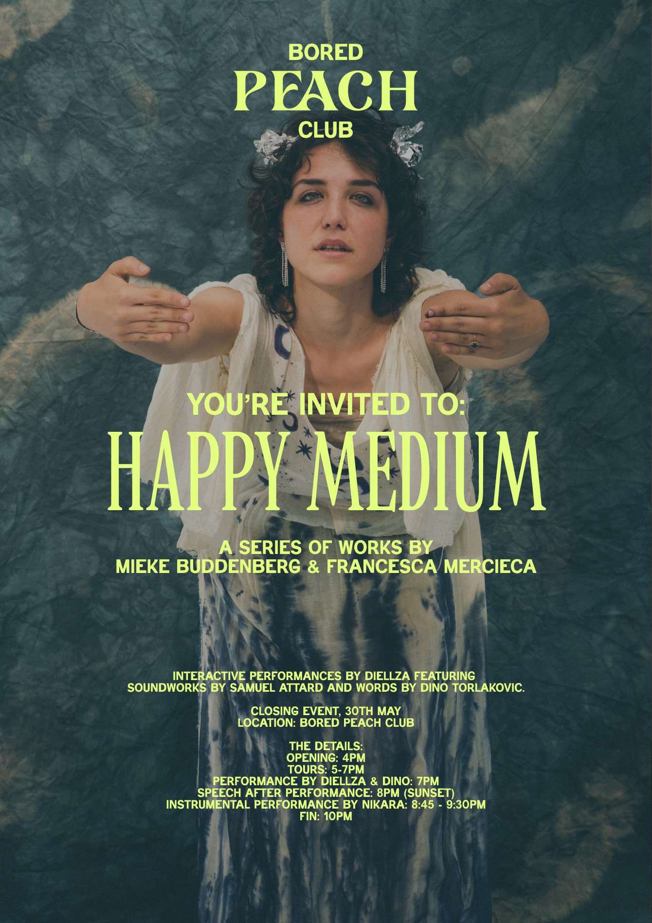 ⸻ Happy Medium was a collaborative performance by Diellza Ilgner and Dino Torlakovic, presented in Gozo as part of an exhibition by set design practitioners Francesca Mercieca and Mieke Make. Blending movement, music, and acting, the piece explored cycles of creation, ritual, and renewal — a poetic reflection on the tension between nourishment and excess. Through physical expression and spoken word, Ilgner and Torlakovic transformed the space into a living tableau of emotion and rhythm, inviting the audience into a sensorial experience that blurred the lines between performer and observer. ⸻